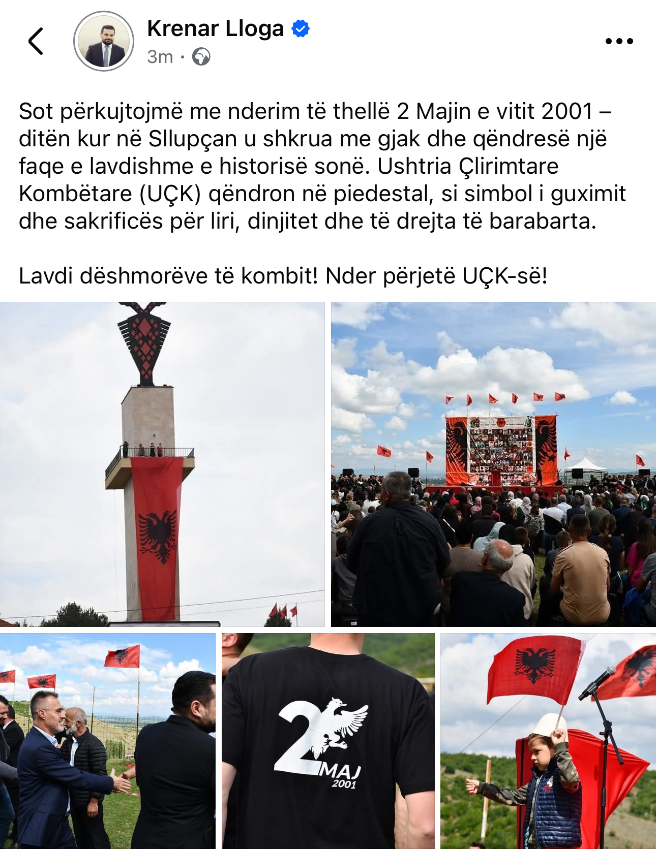 Sot përkujtojmë me nderim të thellë 2 Majin e vitit 2001 – ditën kur në Sllupçan u shkrua me gjak dhe qëndresë një faqe e lavdishme e historisë sonë. Ushtria Çlirimtare Kombëtare (UÇK) qëndron në piedestal, si simbol i guximit dhe sakrificës për liri, dinjitet dhe të drejta të barabarta.