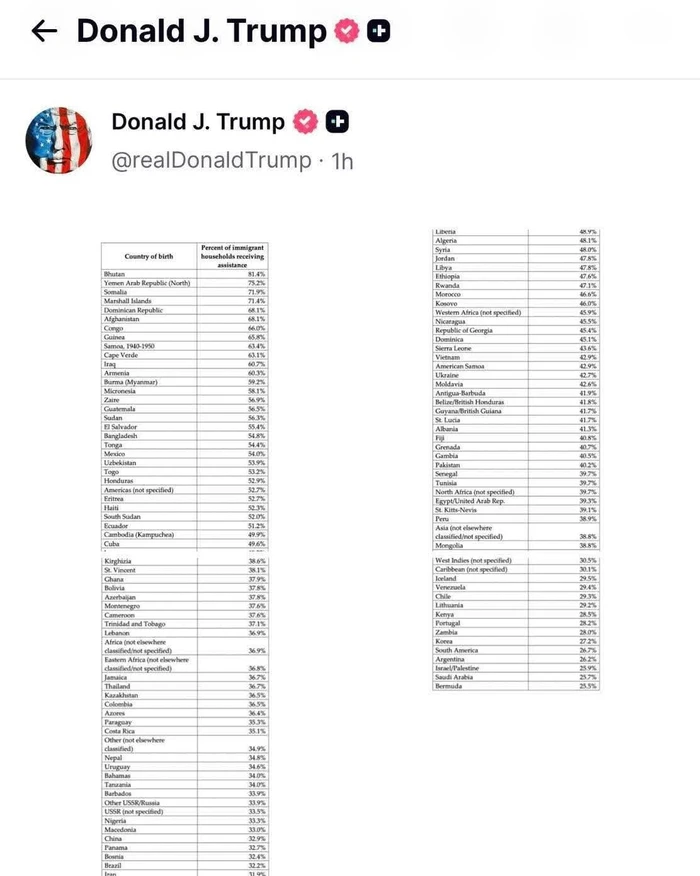 Presidenti i Shteteve të Bashkuara, Donald J. Trump, ka publikuar në rrjetet sociale të dhëna statistikore që tregojnë përqindjen e familjeve të emigrantëve në SHBA që përfitojnë ndihmë sociale, të klasifikuara sipas vendit të origjinës.