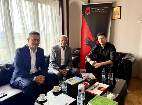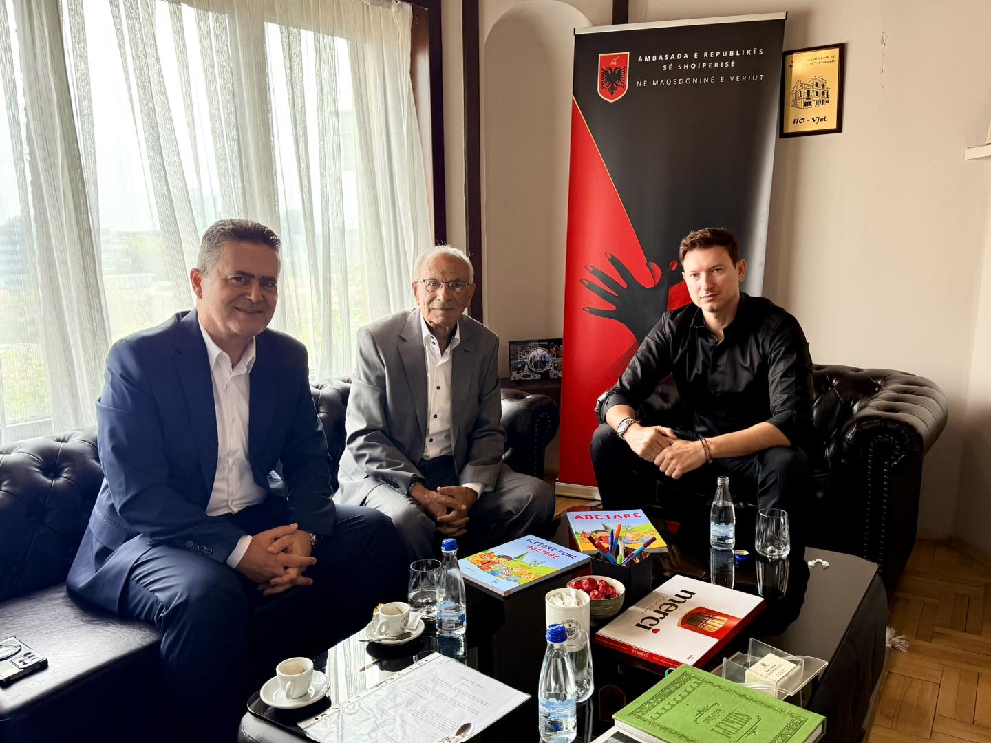 Ambasadori i Shqipërisë në Maqedoninë e Veriut, Denion Meidani, priti në një takim të veçantë në Ambasadë profesorin e njohur dhe pedagogun e shquar shqiptar, prof. dr. Avzi Mustafa. Në këtë vizitë ishte i pranishëm edhe Konsulli i Nderit i Shqipërisë, z. Imer Selmani.