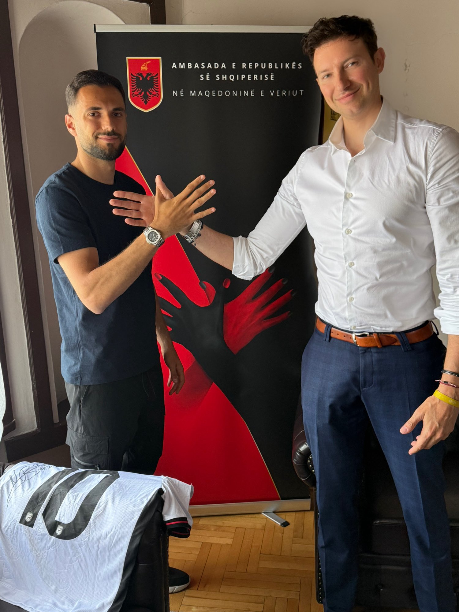 “Sot në Ambasadë pata kënaqësinë të pres me përzemërsi Nedim Bajramin, një djalë shembullor, brenda dhe jashtë fushës. Me origjinë nga Maqedonia e Veriut dhe fanellën kuqezi në zemër, Nedim është simbol i përkushtimit, karakterit dhe sportivitetit që na bën të gjithëve krenarë,” – shkruan ambasadori Meidani.