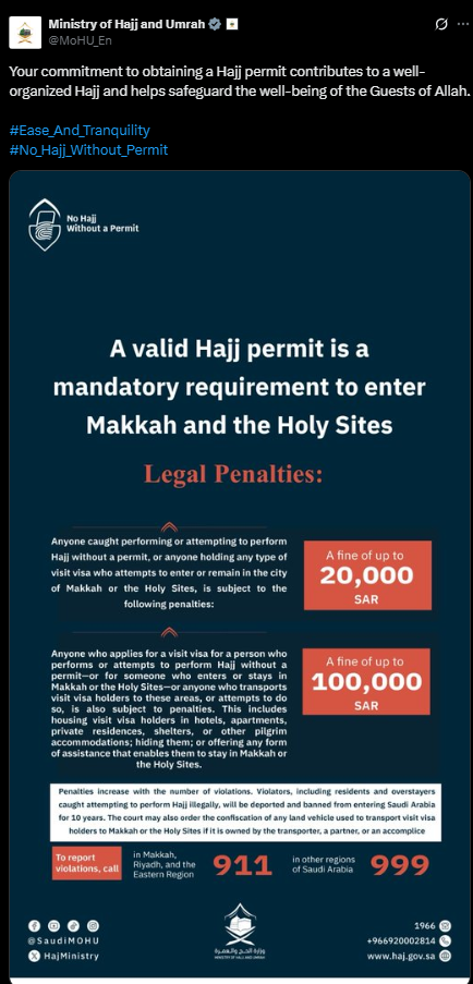 Ministria e Haxhit dhe Umres e Arabisë Saudite ka njoftuar gjoba të rënda deri në 100,000 SAR (rreth 26,000 dollarë – rreth 24,000 euro) dhe një ndalim të mundshëm hyrjeje në Mbretëri për shkelësit e rregullave të vizave të Haxhit.