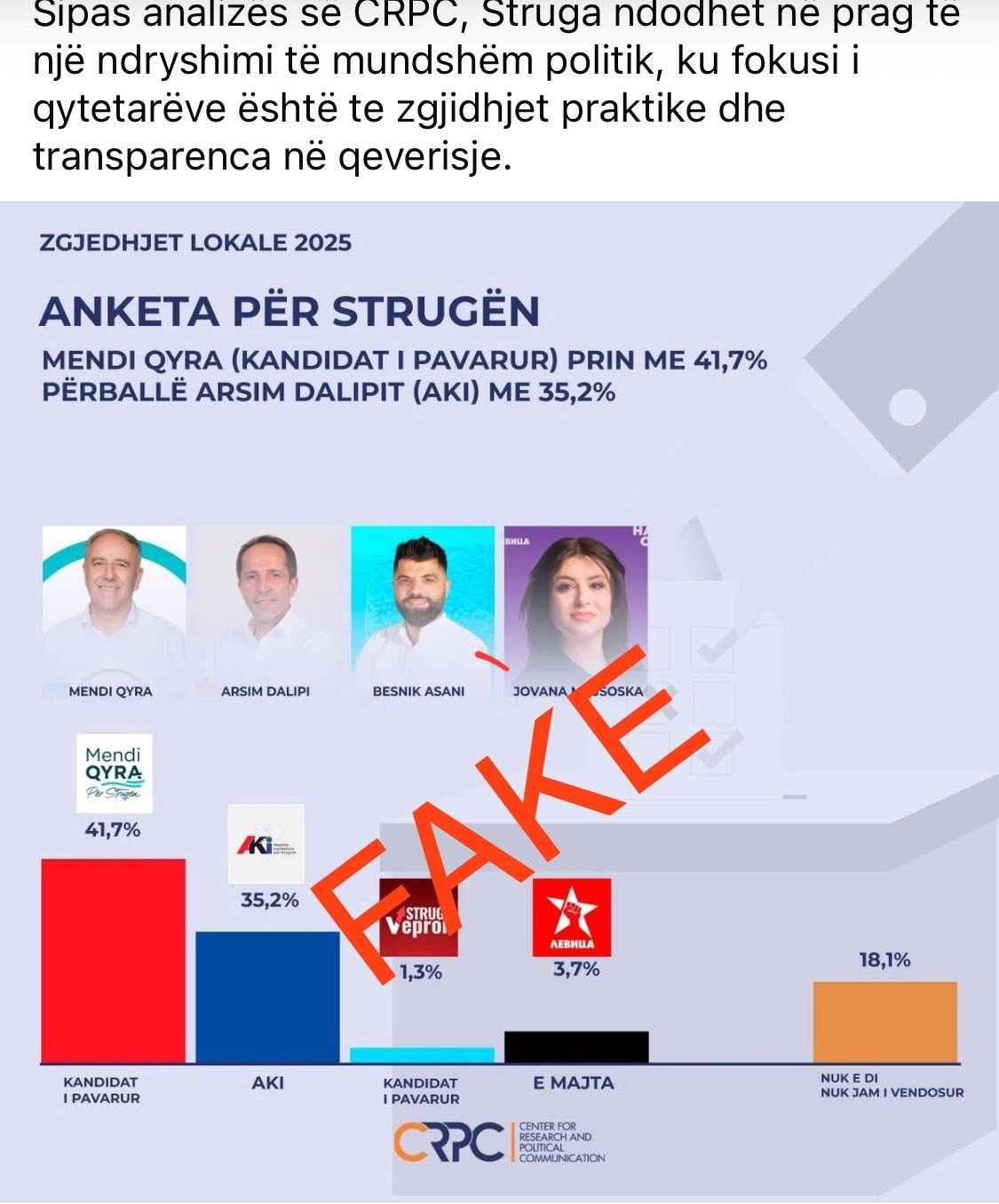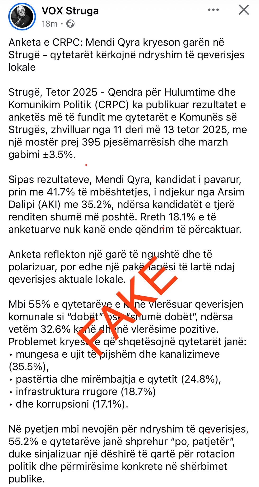 Sipas Bajramit, këta persona të veshur me pushtet po shpërndajnë lajme të rreme dhe “sondazhe” të fabrikuara nga një qendër të ashtuquajtur CRPC (Center for Research and Political Communication), e cila, sipas tij, nuk është kompani reale që merret me kërkime shkencore, por një faqe e regjistruar në emër të portalit informativ FOL, pronar i të cilit është Latif Arifi.