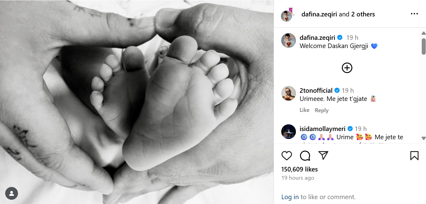 Lajmin e bukur e ka ndarë vetë Dafina me ndjekësit e saj në rrjetet sociale, ku ka publikuar një fotografi të këmbëve të vogla të të porsalindurit, duke e shoqëruar me një mbishkrim të thjeshtë, por shumë emocional, që nënkupton fillimin e një kapitulli të ri në jetën e saj.