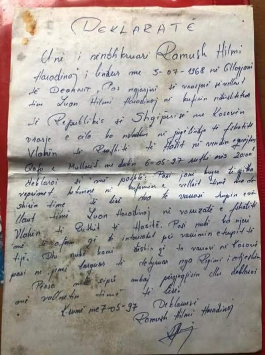 Një dokument i rrallë dhe me rëndësi historike është bërë publik: një deklaratë me shkrim dore e Ramush Haradinajt, e datës 7 maj 1997, në të cilën ai kërkon lejimin e varrosjes së vëllait të tij, Luan Haradinaj, në fshatin Vlanë, në zonën e Hasit të Shqipërisë.