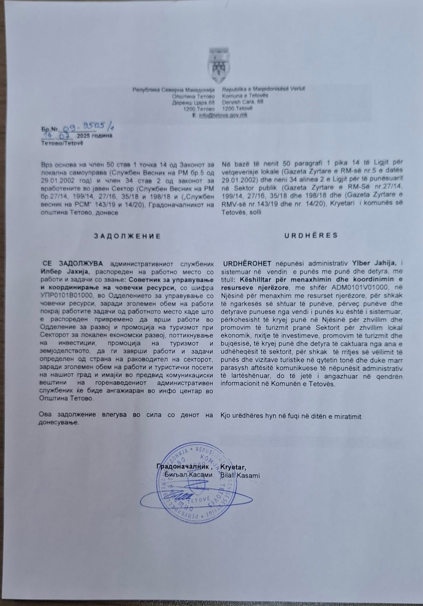 Tetovë, 14 korrik 2025 – Gazetari dhe administratori i portalit Top24.mk, Ylber Jahiu, ka reaguar publikisht ndaj një vendimi të fundit të marrë nga kryetari i Komunës së Tetovës, Bilall Kasami.