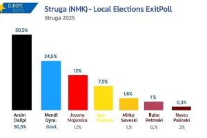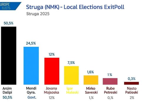 Sipas të dhënave të para të siguruara nga Europe Elects, rezultatet e exit poll-eve për zgjedhjet lokale në Strugë tregojnë një avantazh të qartë të kandidatit Arsim Dalipi, i cili kryeson me 50.5% të votave të anketuara. Diferenca ndaj kundërshtarit më të afërt tregon një tendencë të fortë të mbështetjes elektorale për Dalipin që në fazën e parë të numërimit.