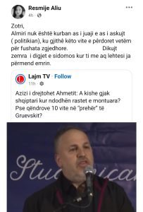 “Zotëri, Almiri nuk është kurban as i juaji e as i askujt (politikan). Ku gjithë këto vite e përdorni vetëm për fushata zgjedhore. Dikujt zemra i digjet, e sidomos kur ti me aq lehtësi ia përmend emrin”, shkruan ajo