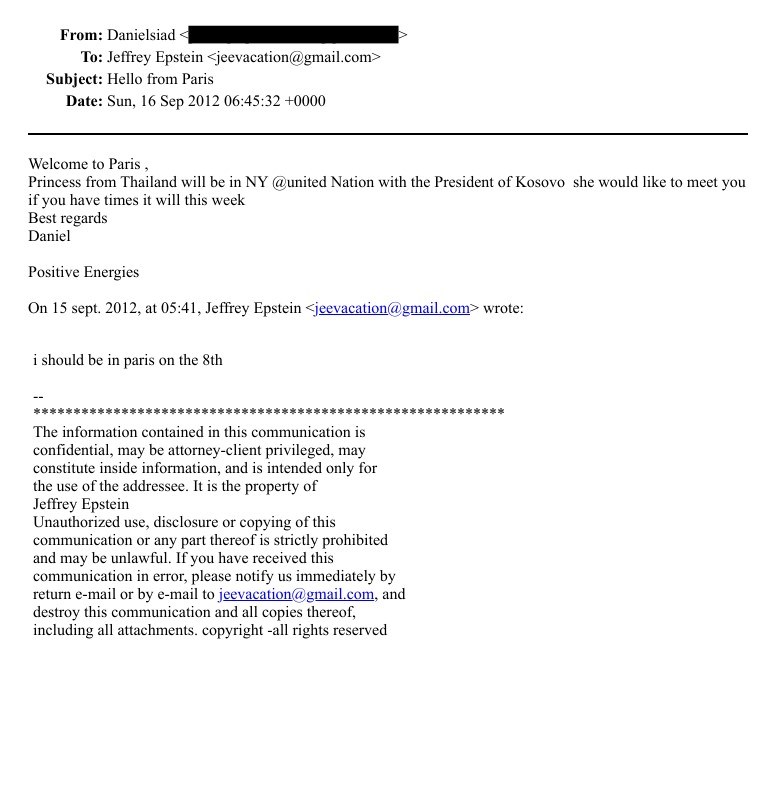 Në mesazhet e publikuara nga Departamenti i Drejtësisë në SHBA, si pjesë të emailëve të shumta të Epstein, një person me emrin “Daniel”, identiteti i të cilit mbetet i panjohur, shkruan në datën 16 Shtator 2012: Mirë se vini në Paris, Princesha nga Tajlanda do të jetë në Nju Jork, në Kombet e Bashkuara, së bashku me Presidentin e Kosovës dhe do të dëshironte t’ju takonte, nëse keni kohë, që këtë javë.