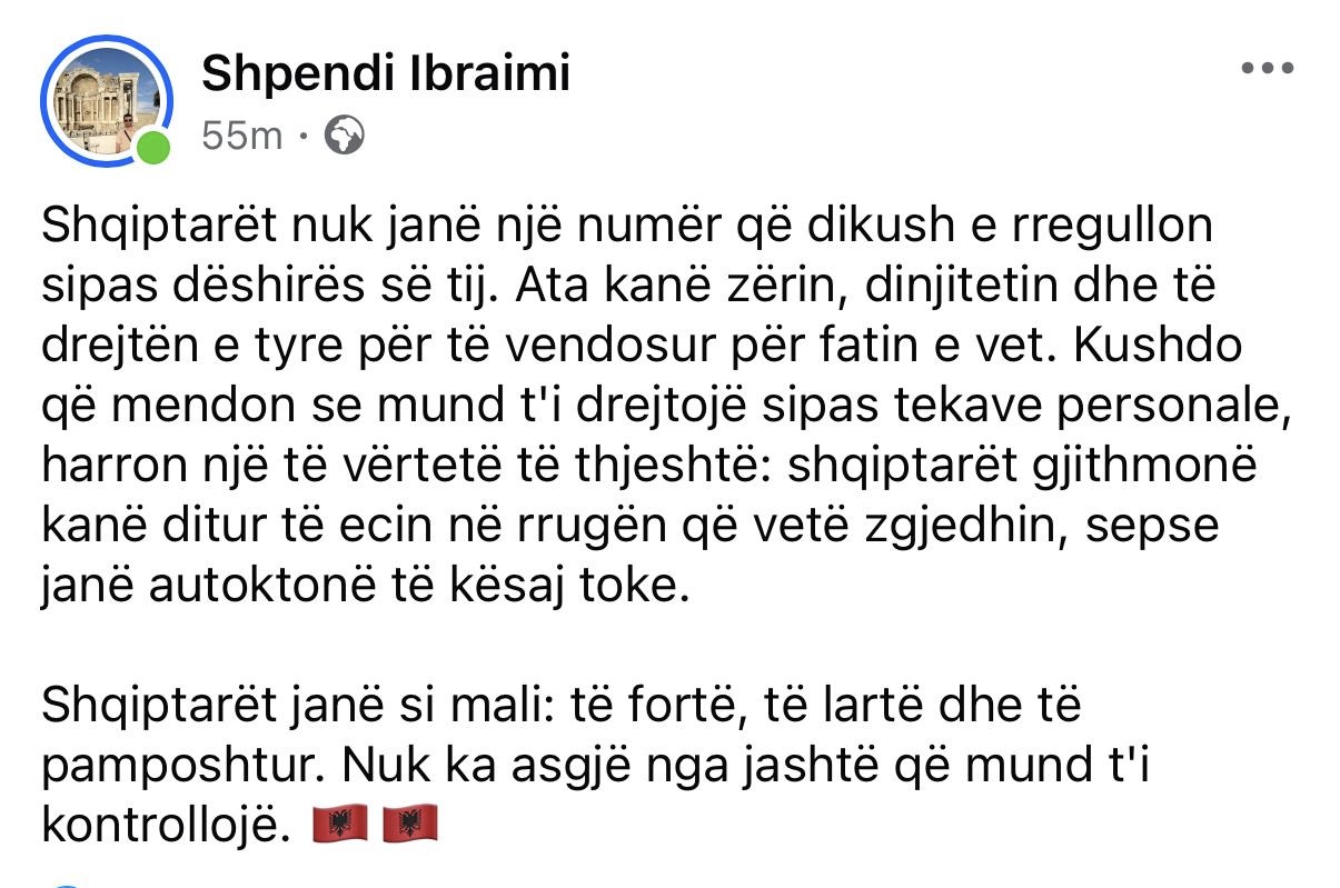 “Kushdo që mendon se mund t’i drejtojë shqiptarët sipas tekave personale, harron një të vërtetë të thjeshtë: shqiptarët gjithmonë kanë ditur të ecin në rrugën që vetë zgjedhin, sepse janë autoktonë të kësaj toke,” – ka shkruar Ibraimi në reagimin e tij.