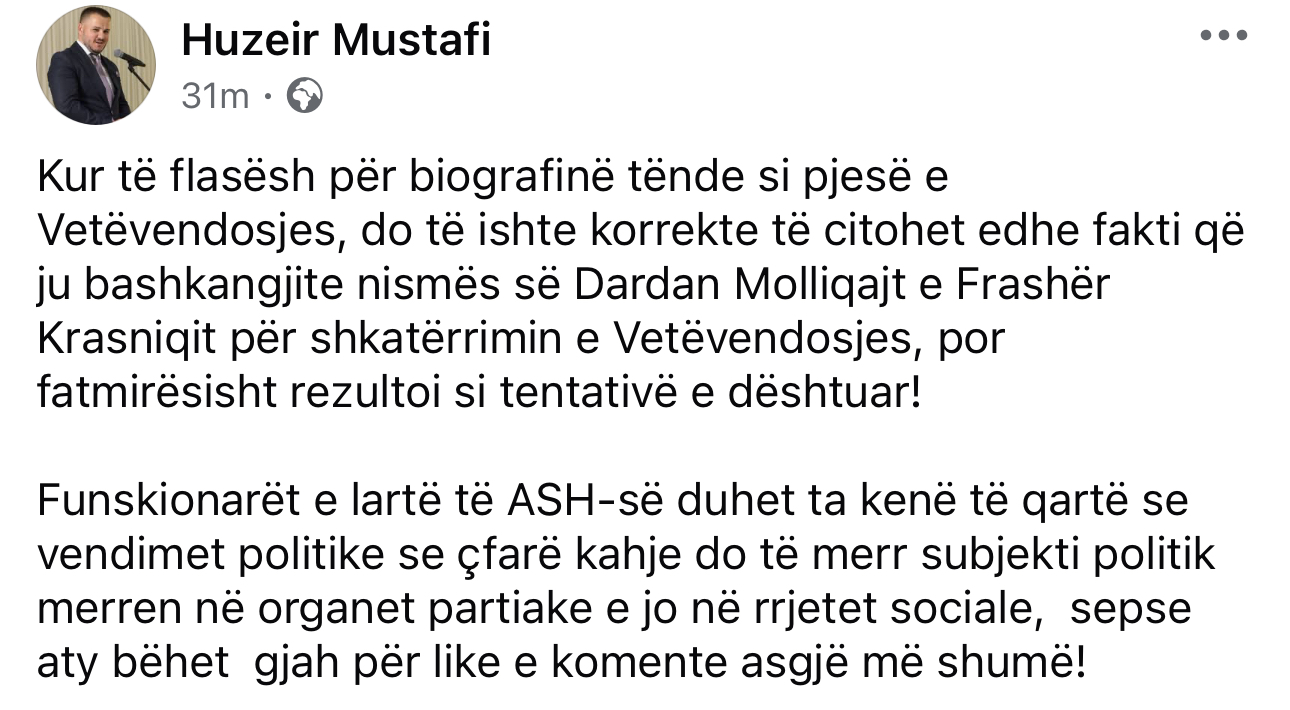 Huzeir Mustafi ka reaguar ndaj deklaratave të Arben Fetait, duke theksuar se kur flitet për biografinë politike në kuadër të Vetëvendosjes, është e rëndësishme të përmendet edhe pjesëmarrja në nismën e Dardan Molliqajt dhe Frashër Krasniqit, e cila, sipas tij, synonte shkatërrimin e Vetëvendosjes – një përpjekje që fatmirësisht dështoi.