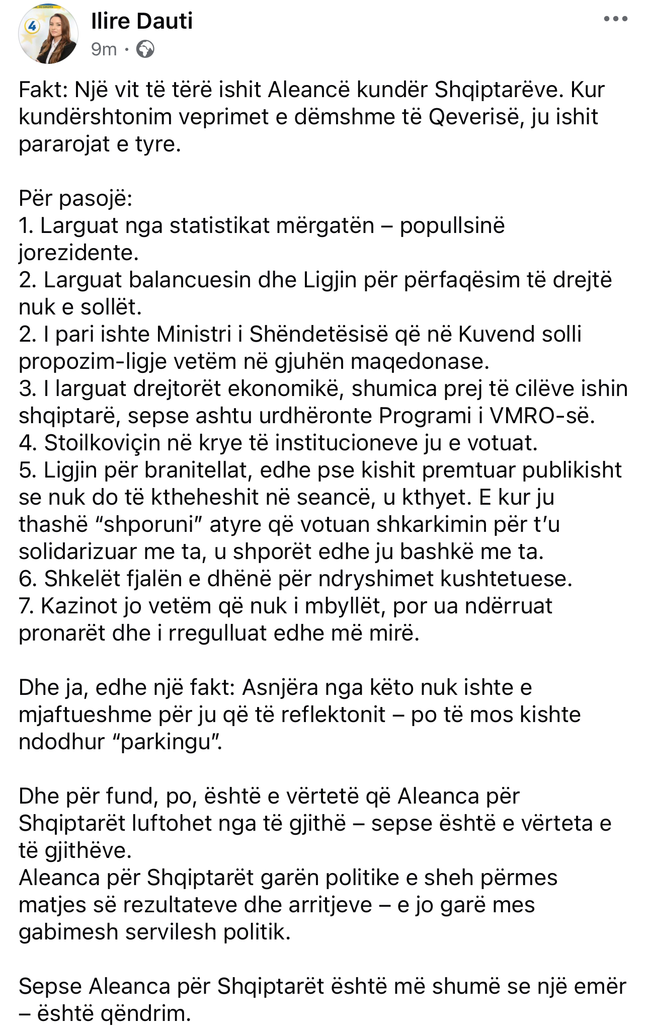 “Një vit të tërë ishit Aleancë kundër Shqiptarëve. Kur ne kundërshtonim veprimet e dëmshme të qeverisë, ju ishit pararojat e tyre,” shkruan Dauti, duke renditur një sërë akuzash konkrete: