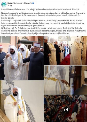 Bashkësia Islame e Kosovës ka njoftuar se Imamit i Qabesë, Dr. Bandar Belilah, i cili po qëndron për vizitë zyrtare në Kosovë, ka udhëhequr faljen e namazit të xhumasë dhe ka mbajtur hytben para besimtarëve në Xhaminë e Madhe në Prishtinë