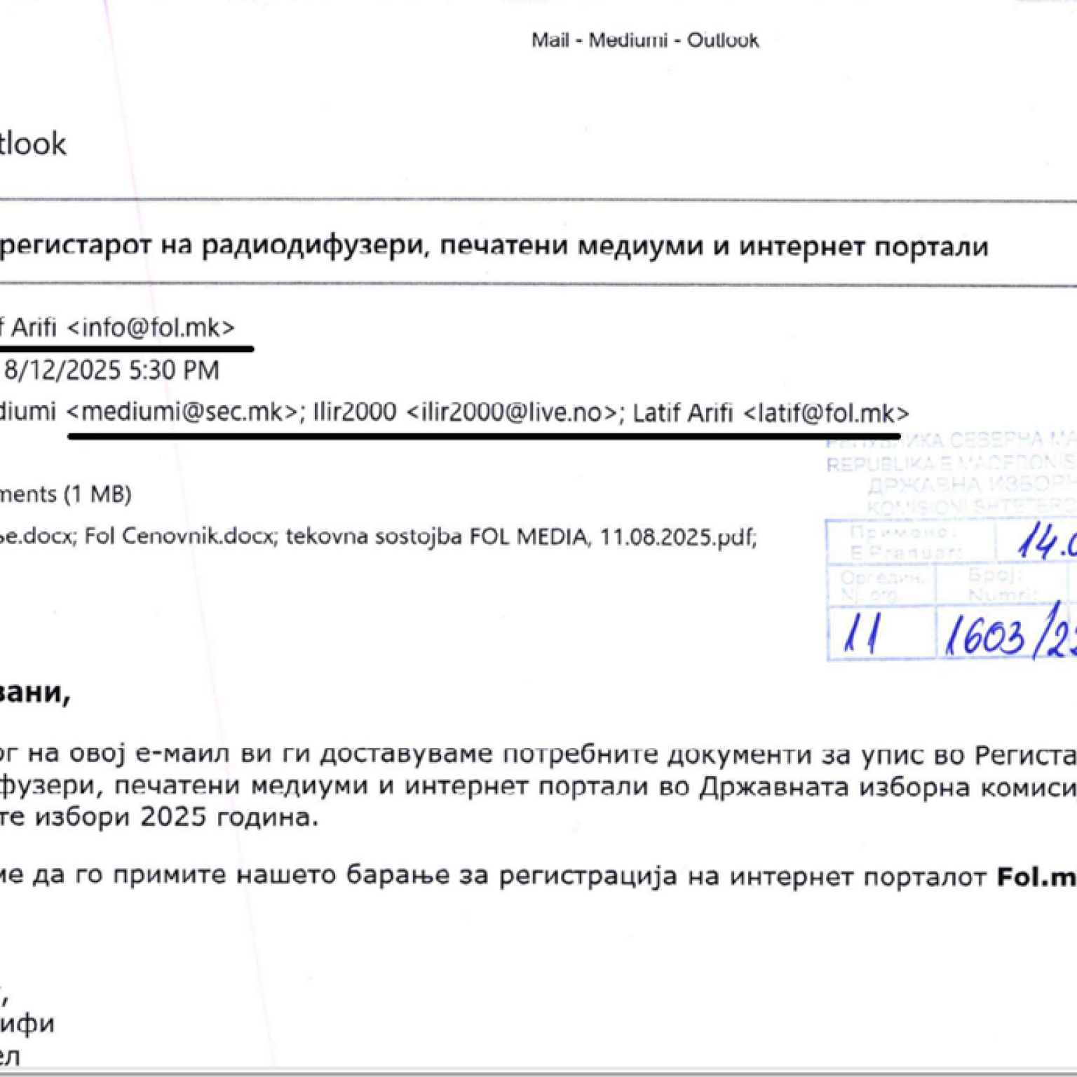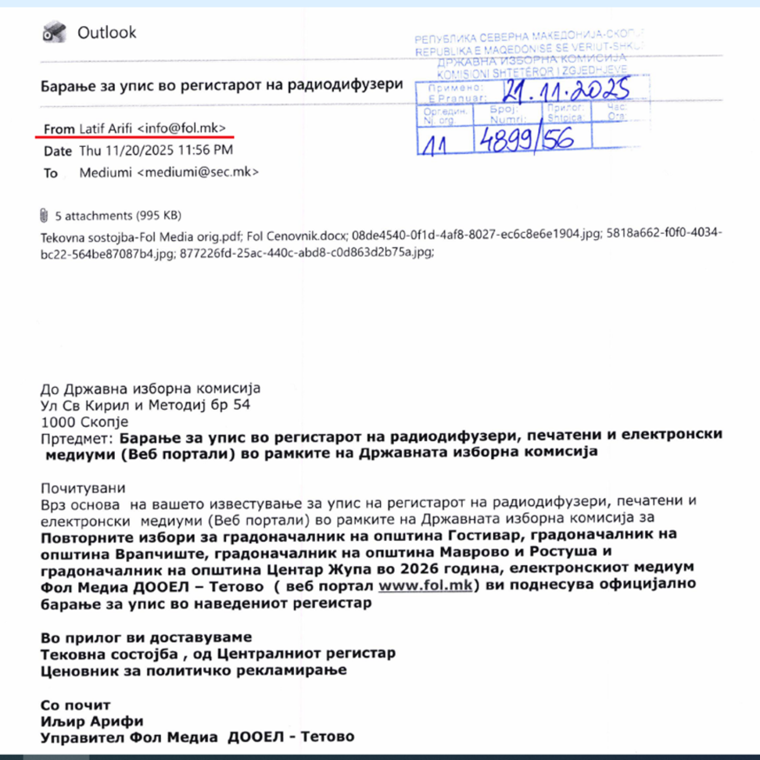 Në dokumentet e publikuara nga KSHZ thuhet se kërkesën për regjistrim në regjistrin e radiodifuzerëve, mediave të shtypura dhe portaleve në internet e ka dorëzuar Latif Arifi, i cili ka paraqitur dokumentacionin e nevojshëm për regjistrim. Kjo ka ndodhur në dy raste – për rrethin e parë të zgjedhjeve lokale, kërkesa është dorëzuar në mes të gushtit.
