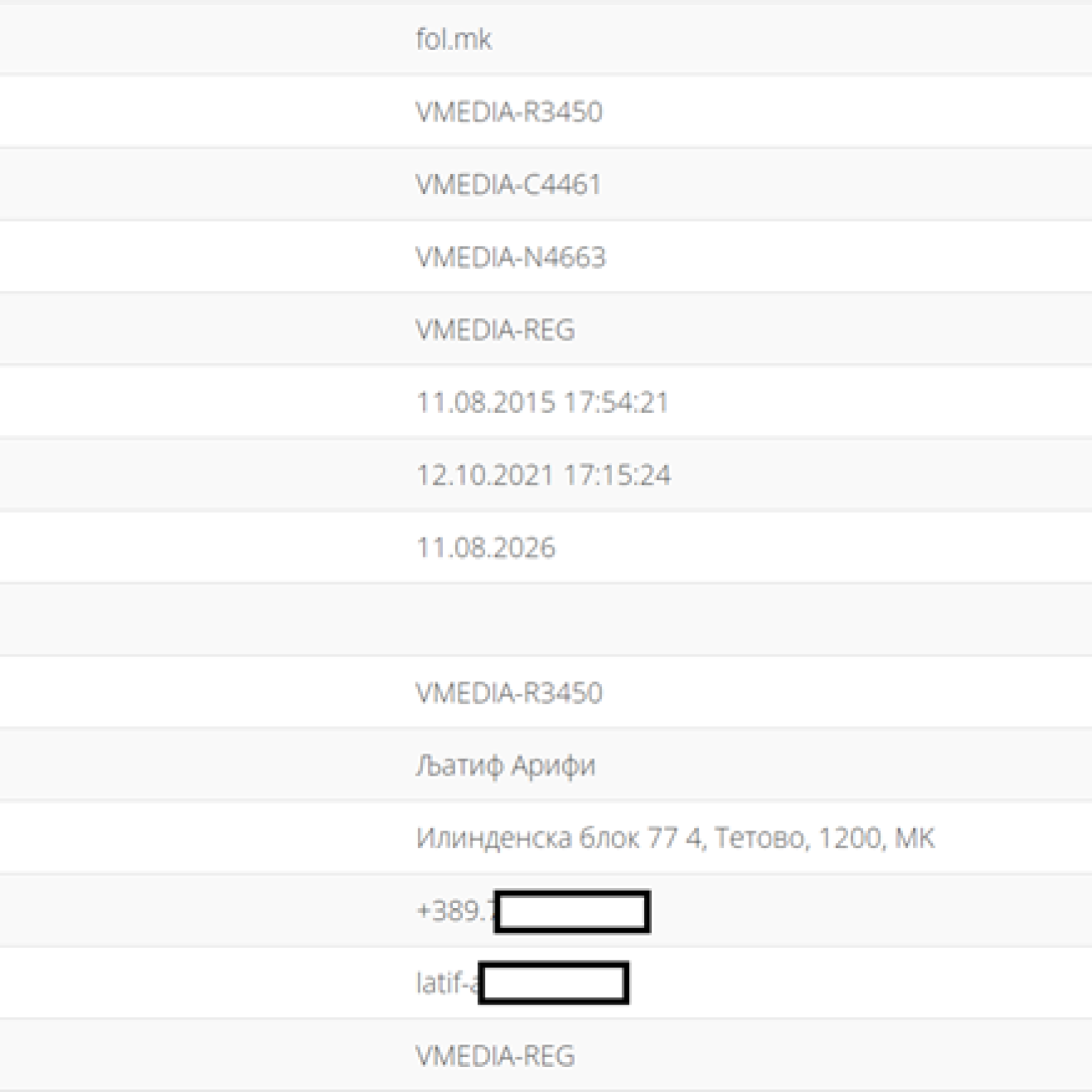 Sipas regjistrit zyrtar të MARNET-it, i cili është regjistri zyrtar për domenet .mk në vend, domeni fol.mk është i regjistruar nga Latif Arifi nga Tetova, i shënuar si regjistrant dhe kontakt administrativ. Kjo e konfirmon statusin e tij si pronar i domenit, i vlefshëm deri në gusht 2026. Adresa e deklaruar nga Latif Arifi është edhe adresa aktuale e Fol.mk e shënuar në faqen e medias. Numri i telefonit i lënë në MARNET, nëse futet në aplikacionin Viber, shfaq fotografinë e koordinatorit nacional Latif Arifi.