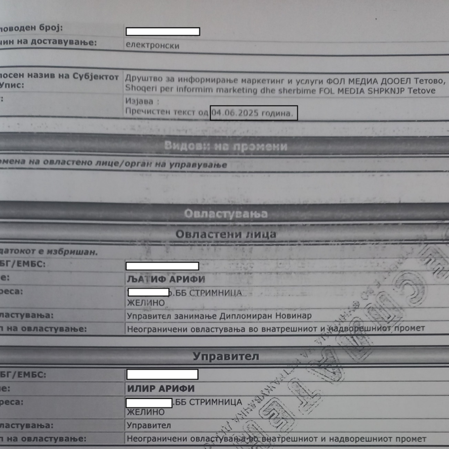 Emri i Latif Arifit paraqitet edhe në dokumentet zyrtare të dorëzuara nga Fol.mk në Komisionin Shtetëror të Zgjedhjeve (KSHZ) që media të mund të përfitojë para shtetërore për reklamim zgjedhor.