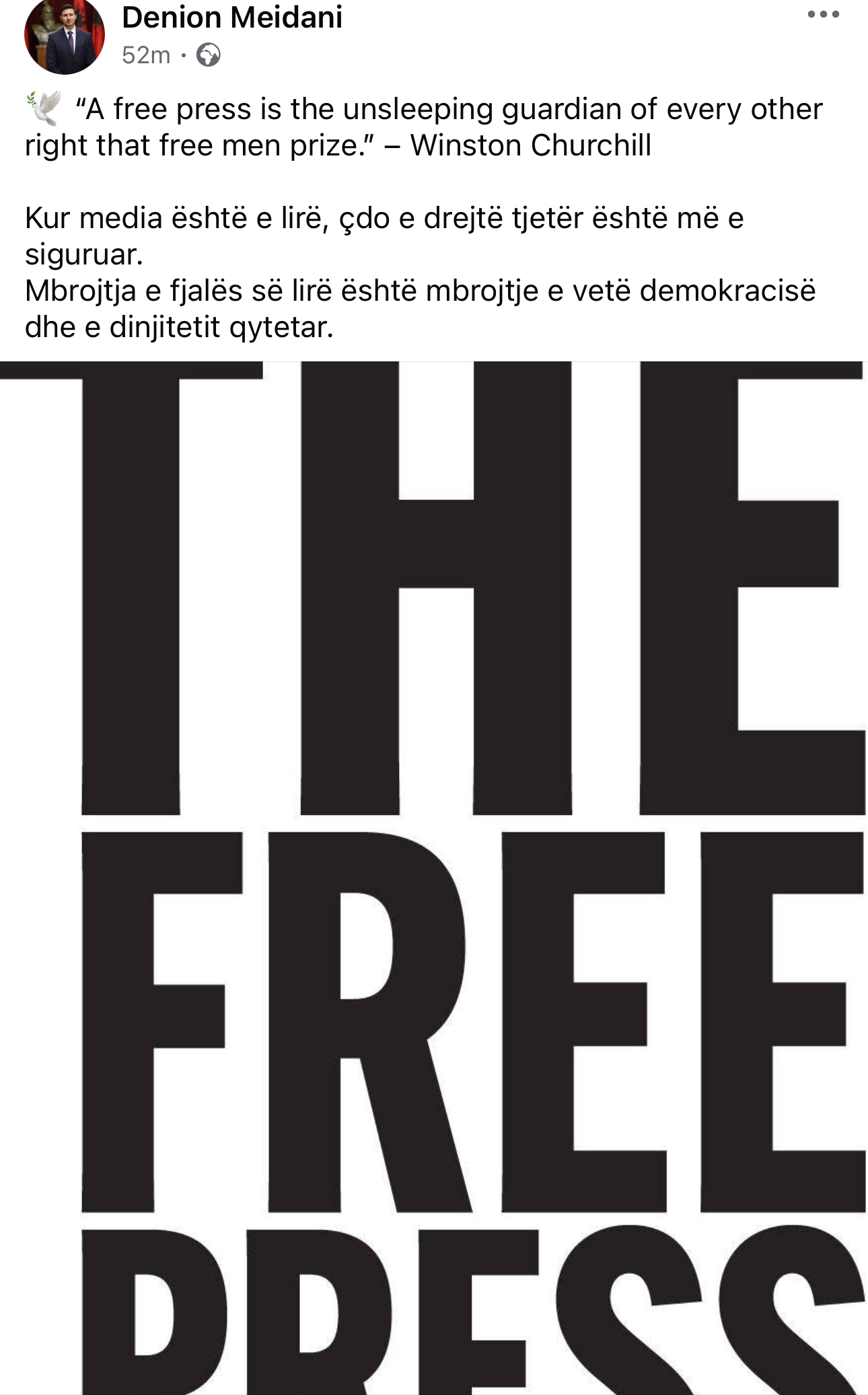 Ambasadori i Shqipërisë në Maqedoninë e Veriut, Denion Meidani, reagoi me një mesazh ku theksoi rëndësinë e mbrojtjes së fjalës së lirë, duke cituar Winston Churchill: