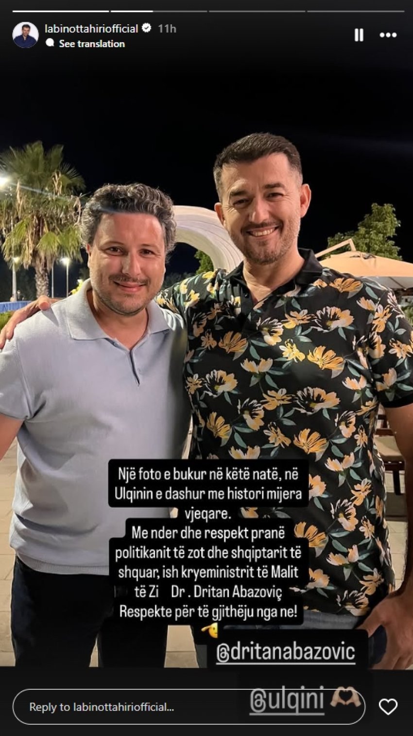 “Një foto e bukur në këtë natë, në Ulqinin e dashur me histori mijëra vjeçare. Me nder dhe respekt pranë politikanit të zot dhe shqiptarit të shquar, ish-kryeministrit të Malit të Zi, Dr. Dritan Abazoviq. Respekte për të gjithë ju nga ne!”, ka shkruar Labin mbi fotografinë e publikuar.