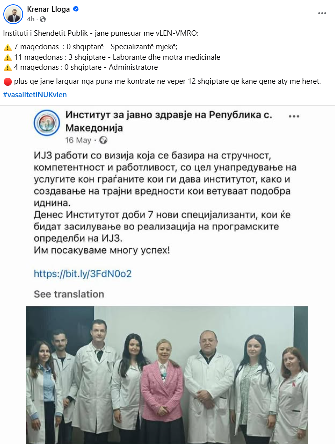 Nën qeverisjen e VLEN-VMRO, Instituti i Shëndetit Publik është bërë shembull i një pabarazie shqetësuese në punësime – kështu ka deklaruar ish-ministri i Drejtësisë, Krenar Lloga, në një postim publik.