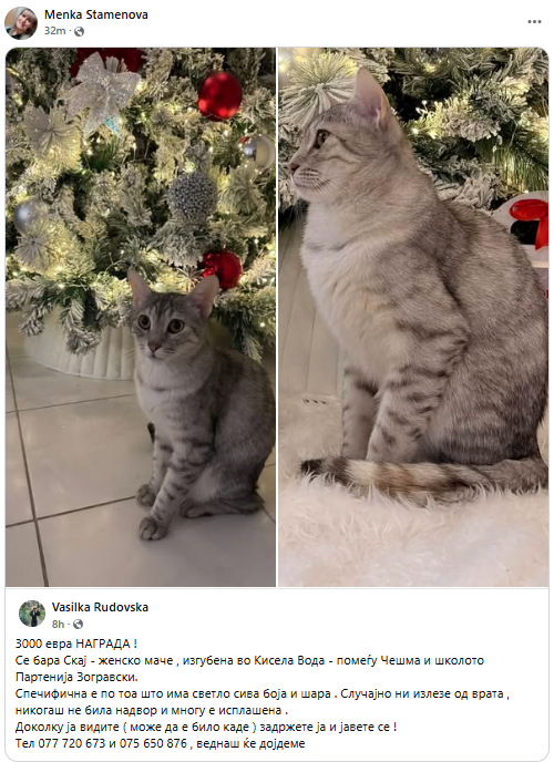 Kërkohet Skaj – Mace femër, e humbur në Kisela Vodë, mes Çeshmës dhe shkollës “Partenija Zografski”.