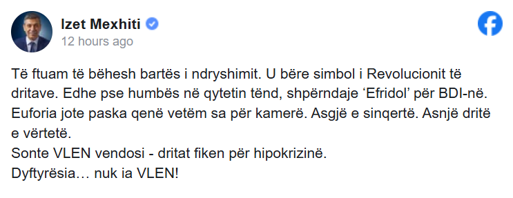 Kreu i Lëvizjes Demokratike, pjesë e VLEN, Izet Mexhiti ka shkruar një shkrim një rrjetet sociale, ku kujton Arben Taravarin nga Aleanca për Shqiptarët që në bashkimin e tij në VLEN u bë simbol i Revolucionit, si pse gjatë zgjedhjeve ishte humbas në qytetin e vet, shpërndaje ‘Efridol’ për BDI-në, ndërsa tani iu janë fikur dritat për hipokrizi, shkruan Zhurnal.mk