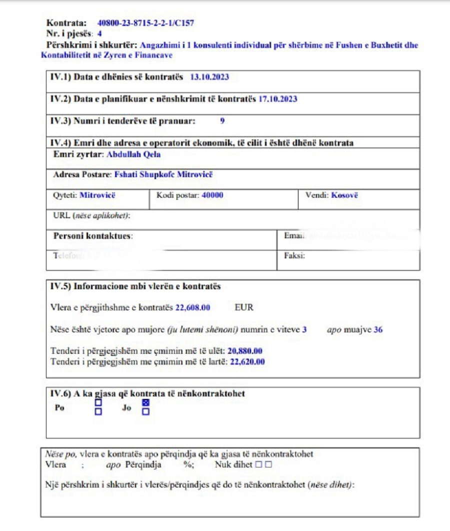 Abdullah Qela në tetor të vitit 2023, kishte fituar kontratë në cilësinë e konsulentin në Agjencinë e Ushqimit dhe Veterinarisë për periudhën kohore 36 muaj. Kontrata që Qela kishte fituar në AUV peshon mbi 20 mijë euro në institucionin që kujdeset për sigurinë ushqimore.