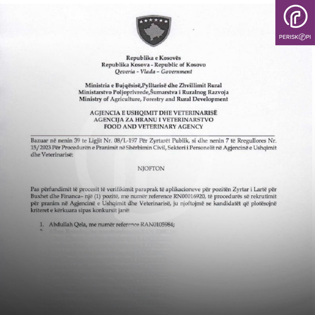 Periskopi ka deshifruar me dëshmi se si nga konsulenti që është punësuar fillimisht, Abdullah Qelës i është hapur pozita e punës në këtë agjenci që është nën ombrellën e Ministrisë së Bujqësisë që drejtohet nga Faton Peci.