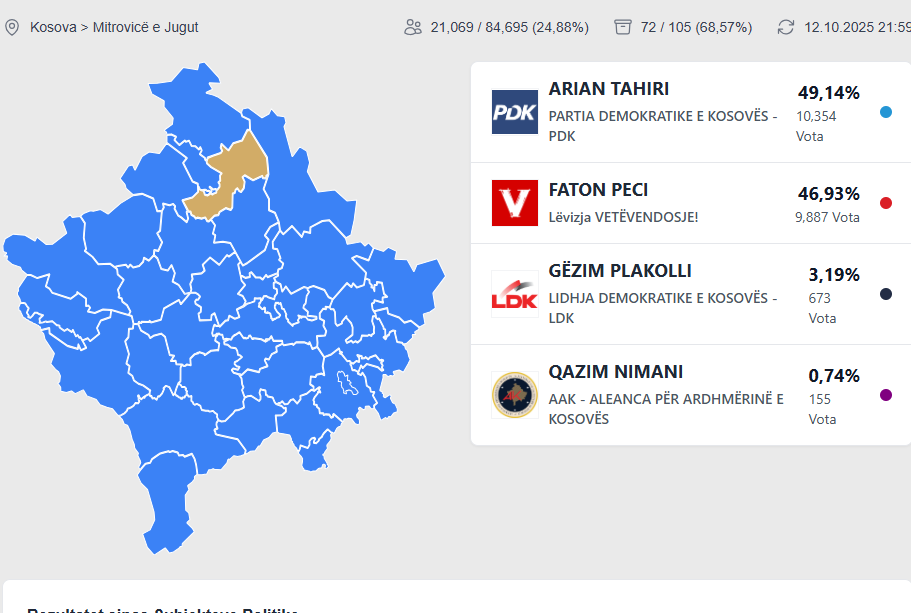 Mitrovicën: 21 mijë vota të numëruara – Arian Tahiri 49.1%, Faton Peci 46.9% Shpërndaje FacebookTwitterPinterestWhatsApp 21 mijë vota janë numëruar nga gjithsejt 32 mijë në Mitrovicë. Arian Tahiri i PDK-së është në 49,1%, me 10 mijë e 354 vota. Faton Peci i VV-së është në 46.9%, me 9 mijë e 887 vota. Artikulli paraprakTotaj prin në Prizren me 44.36 për qind të votave, Abrashi i dytiArtikulli tjetër🏆 Shqiptari nga Luboteni ngre flamurin në Rumani, Omer Memedi shpallet kampion ballkanik në mundje! REKLAMËREKLAMË lajmet e fundit Ambasadorët e BE-së takojnë Kurtin: Pa dialog me Serbinë nuk ka përparim në integrimin evropian January 14, 2026 0 Shefi i Zyrës së Bashkimit Evropian në Kosovë, Aivo Orav ka bërë të ditur se së bashku me ambasadorët e BE-së dhe shefat e... Trump protestuesve iranianë: “Ndihma është në rrugë”- paralajmëron veprime të forta ndaj Teheranit January 14, 2026 0 Donald Trump u ka dërguar një mesazh protestuesve iranianë duke deklaruar se “ndihma është në rrugë”, në një kohë kur Irani po përballet me... Kasami dhe Qoku me BMW 150 mijë euro — dëshmi e “suksesit ekonomik” pas dy vitesh qeverisje January 14, 2026 0 Në takimin e fundit të liderëve politikë, vëmendja nuk u përqendrua vetëm te temat politike, por edhe te paraqitja luksoze e dy figurave të... Osmani s’është e padiskutueshme për LVV-në, partia e Kurtit çon mesazh se “mbeten të hapura” opsionet për Presidentin January 14, 2026 0 Vjosa Osmani po kërkon të rizgjidhet presidente për t’i vazhduar “punët e mira dhe të përbashkëta” me Albin Kurtin, partia e të cilit aktualisht... Serbia shmang eurodeputetët, thellohen tensionet me BE-në January 14, 2026 0 Presidenti i Serbisë, Aleksandar Vuçiç, dhe kryekuvendarja serbe, Ana Bërnabiç, kanë vendosur të shmangin takimet me delegacionin e Parlamentit Evropian, në kuadër të procesit... PËRGJIGJU Anulo përgjigjjen Koment: Ju lutemi shkruani komentin tuaj! Emri:* Ju lutem shkruani emrin tuaj këtu Email:* Keni futur një adresë të pasaktë email! Ju lutem shkruani adresën tuaj e-mail këtu Webfaqja: Ruaj emrin tim, postën elektronike dhe faqen e internetit në këtë shfletues për herën tjetër që komentoj.
