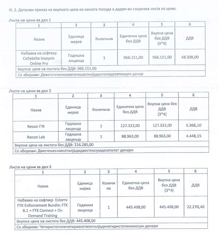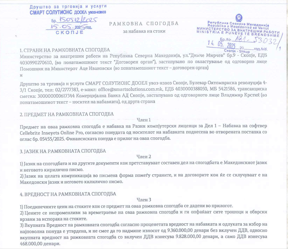 Bëhet fjalë për blerjen e softuerit Cellebrite Inseyets Online Pro, së bashku me mjete të tjera si Recon ITR, Recon Lab dhe Exterro FTK Enforcement Bundle, të cilat janë përfshirë në marrëveshjen kornizë të nënshkruar në maj 2025 mes MPB-së dhe kompanisë “Smart Solutions”.