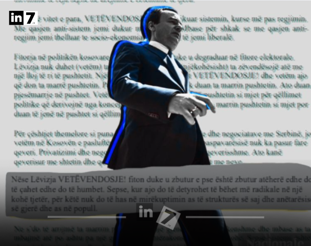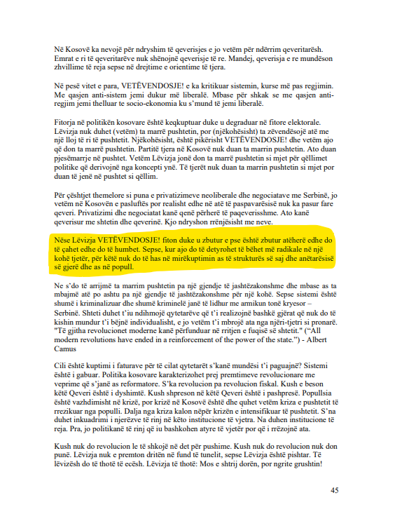“Nëse Lëvizja VETËVENDOSJE! fiton duke u zbutur e pse është zbutur atëherë edhe do të çahet edhe do të humbet. Sepse, kur ajo do të detyrohet të bëhet më radikale në një kohë tjetër, për këtë nuk do të has në mirëkuptimin as të strukturës së saj dhe anëtarësisë së gjerë dhe as në popull”, shkruante aty Albin Kurti.