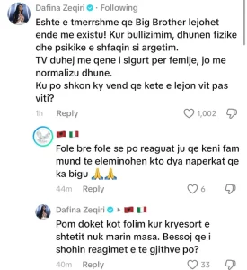 Dafina, e cila shpesh ka shprehur qëndrime të forta kundër dhunës dhe bullizimit, këtë herë u shpreh tejet e indinjuar. Në një koment të lënë në rrjetet sociale, ajo shkroi: “Është e tmerrshme që Big Brother lejohet ende me ekzistu! Kur bullizimin, dhunën fizike dhe psikike e shfaqin si argëtim. TV duhej me qenë i sigurt për fëmije, jo me normalizu dhunë. Ku po shkon ky vend që këtë lejon vit pas viti?”