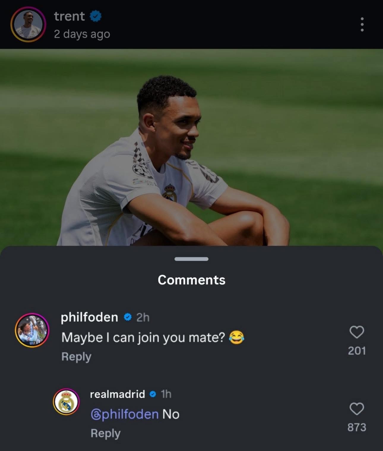 Një episod interesant dhe humoristik ka ndodhur në Instagram mes yllit të Manchester Cityt, Phil Foden, dhe klubit mbretëror spanjoll, Real Madrid. Gjithçka nisi kur përforcimi më i ri i “Los Blancos”, Trent Alexander-Arnold, ndau një postim në rrjetin social për prezantimin e tij si madrilen.