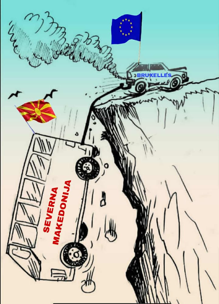 Me gjithë broçkullat e despotit Micko dhe qeverisë së koalicionit për gjoja vazhdim të procesit të integrimit europian, sërish busi i “Severnistani” bie në greminë, ku më kot përpiqet jeep i BE-së për ta nxjerr nga gremina rrangallën e Shkupit!