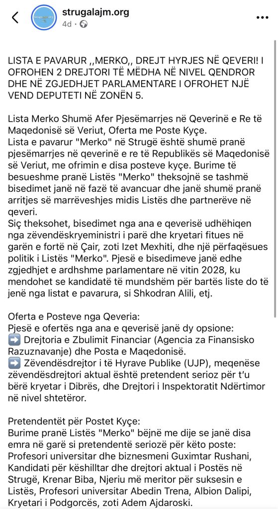 Formalizimi i këtij marrëveshjeje pritet në fund të javës, pasi z. Mexhiti do të qëndrojë në vizitë zyrtare në qytetin e Strugës, ku pritet të jepet edhe deklarata zyrtare e mbështetjes për kandidatin e pavarur për kryetar të Strugës nga lista “Merko”.