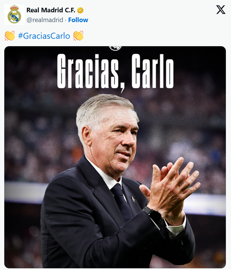 “Trajneri i Real Madridit dhe Carlo Ancelotti kanë arritur një marrëveshje për t’i dhënë fund mandatit të tij si trajner i Real Madridit. Klubi ynë dëshiron të shprehë mirënjohjen dhe dashurinë e tij për një nga legjendat më të mëdha të Real Madridit dhe të futbollit botëror”, thuhet në njoftimin zyrtar të Real Madridit.