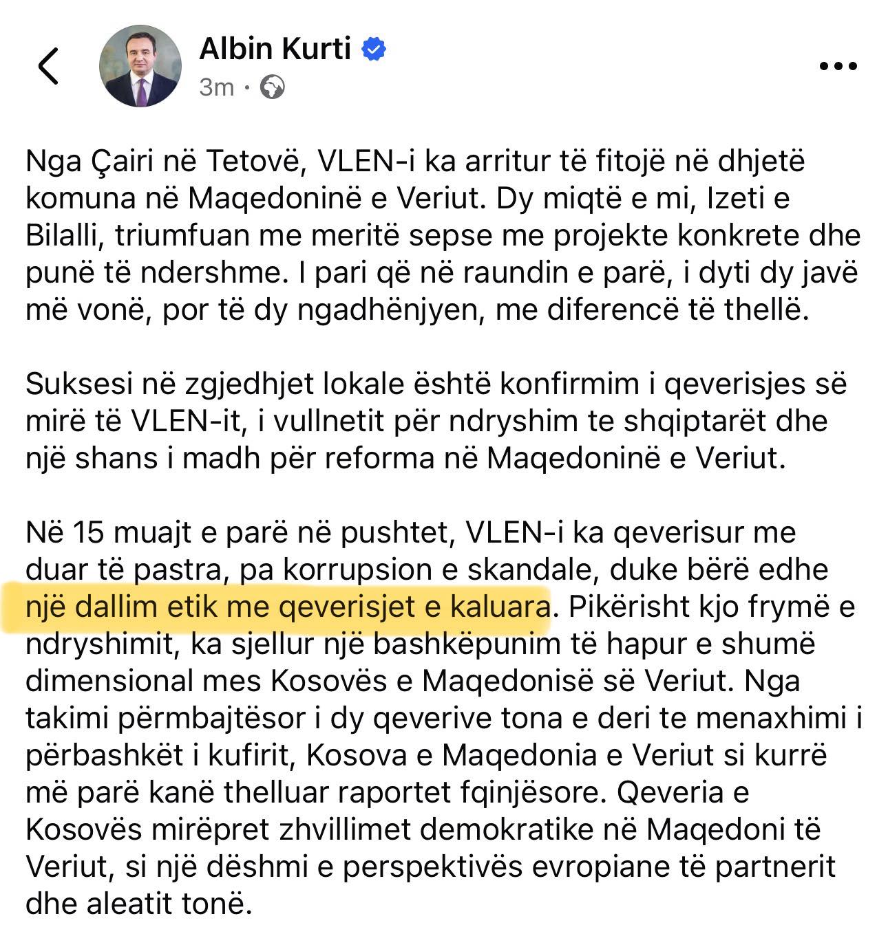 Kryeministri i Kosovës, Albin Kurti, sot përgëzoi koalicionin VLEN për rezultatet në zgjedhjet lokale në Maqedoninë e Veriut, duke e quajtur qeverisjen e tyre “një dallim etik” nga qeveritë e kaluara. Por reagimi nuk vonoi. Aktivisti politik dhe analisti Sefer Selimi i është përgjigjur ashpër, duke listuar një sërë zhvillimesh që, sipas tij, e rrëzojnë komplet narrativën e Kryeministrit.