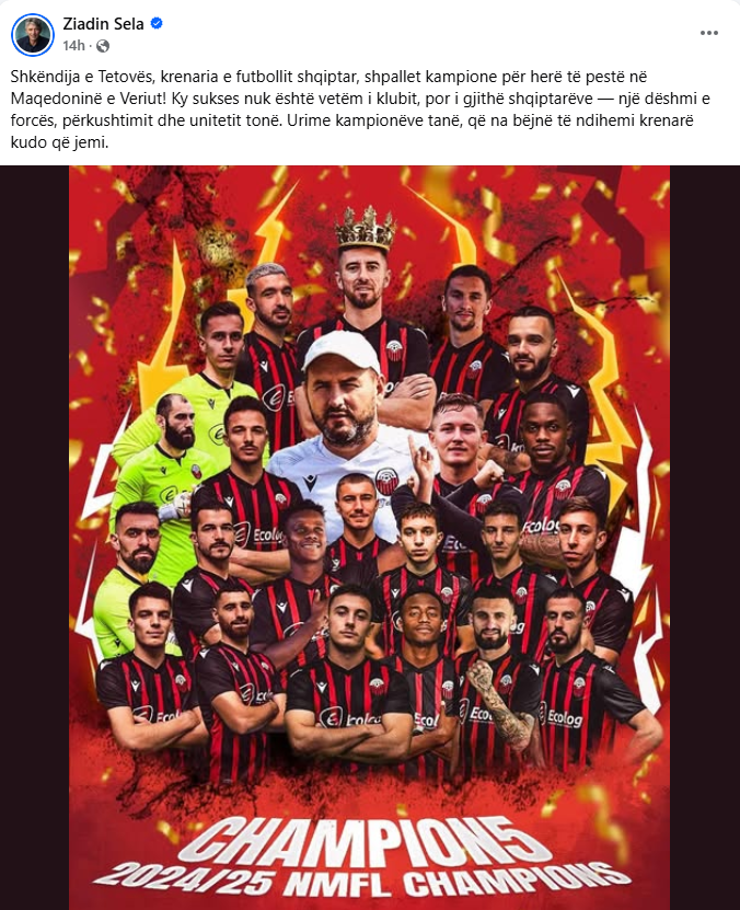 “Shkëndija e Tetovës, krenaria e futbollit shqiptar, shpallet kampione për herë të pestë në Maqedoninë e Veriut! Ky sukses nuk është vetëm i klubit, por i gjithë shqiptarëve — një dëshmi e forcës, përkushtimit dhe unitetit tonë. Urime kampionëve tanë, që na bëjnë të ndihemi krenarë kudo që jemi”, shkruan Sela