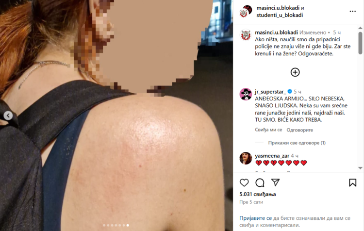 Profili në Instagram “Mashinci u blokadi”, publikoi foto të një studenteje që u sulmua brutalisht nga policia gjatë aksionit të mbrëmshëm para fakulteteve teknike në Beograd.