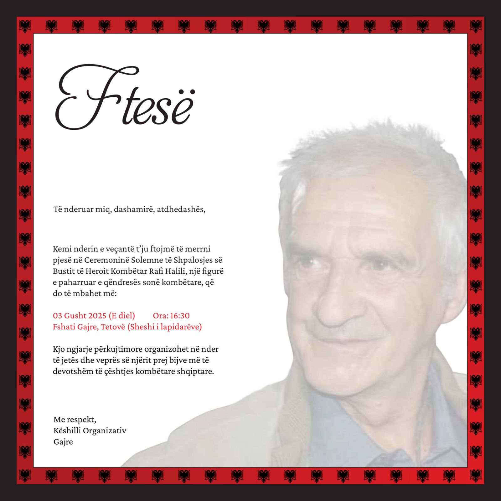Nesër, më 3 gusht 2025 (e diel), në ora 16:30 në fshatin Gajre të Tetovës, në Sheshin e Lapidarëve, do të mbahet ceremonia solemne e shpallosjes së bustit të Heroit Kombëtar Rafi Halili – një prej figurave më të paharruara të qëndresës kombëtare shqiptare.