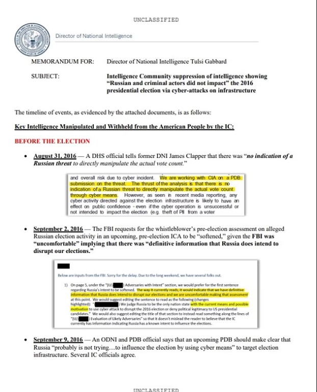 Gabbard publikoi një dokument prej 114 faqesh, që ajo thotë se tregon se administrata Obama ishte në dijeni se nuk kishte asnjë kërcënim që Rusia të manipulonte ‘drejtpërdrejt’ votën në vitin 2016.