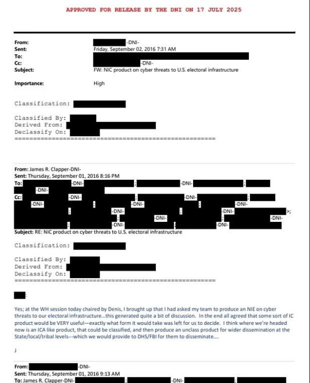 Edhe pse shumë nga dokumentet janë shumë të redaktuara ose të errësuara plotësisht, ato tregojnë biseda midis objektivave të preferuar të Trump, përfshirë ish-shefin e inteligjencës James Clapper, ndërsa zyrtarët debatonin se si ta përshkruanin aktivitetin zgjedhor rus.
