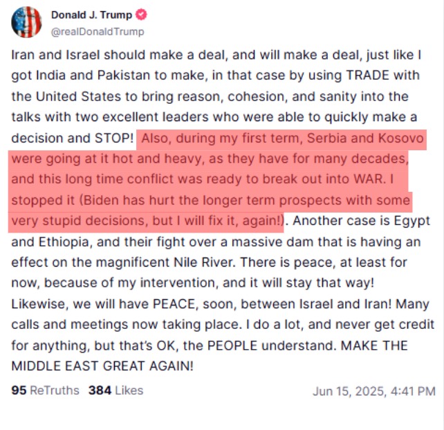 Gjatë një publikimi në Truth Social, ku ka folur për konfliktin mes Izraelit dhe Iranit, ai ka shkruar disa rreshta pikërisht për Kosovën: