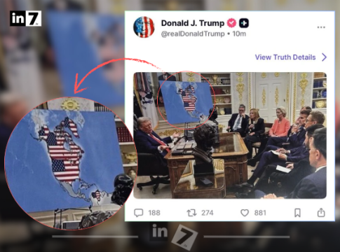 Në njërën nga fotografitë shihet Trump i ulur në Zyrën Ovale me liderë evropianë, ndërsa pranë tij ndodhet një tabelë ku paraqitet një hartë gjeografike e Shteteve të Bashkuara të Amerikës (SHBA), Venezuelës, Grenlandës dhe Kanadasë, të gjitha të mbuluara me flamurin amerikan.