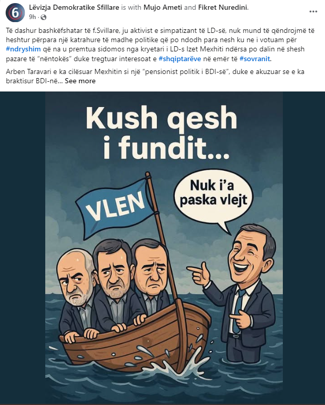 “Të dashur bashkëfshatar të f.Svillare, ju aktivistë e simpatizantë të LD-së, nuk mund të qëndrojmë të heshtur përpara një katrahure të madhe politike që po ndodh para nesh ku ne i votuam për #ndryshim,” thuhet në deklaratën e publikuar nga dega e LD-së në këtë fshat, duke shtuar se ndryshimi i premtuar “sidomos nga kryetari i LD-s Izet Mexhiti” nuk është mbajtur.