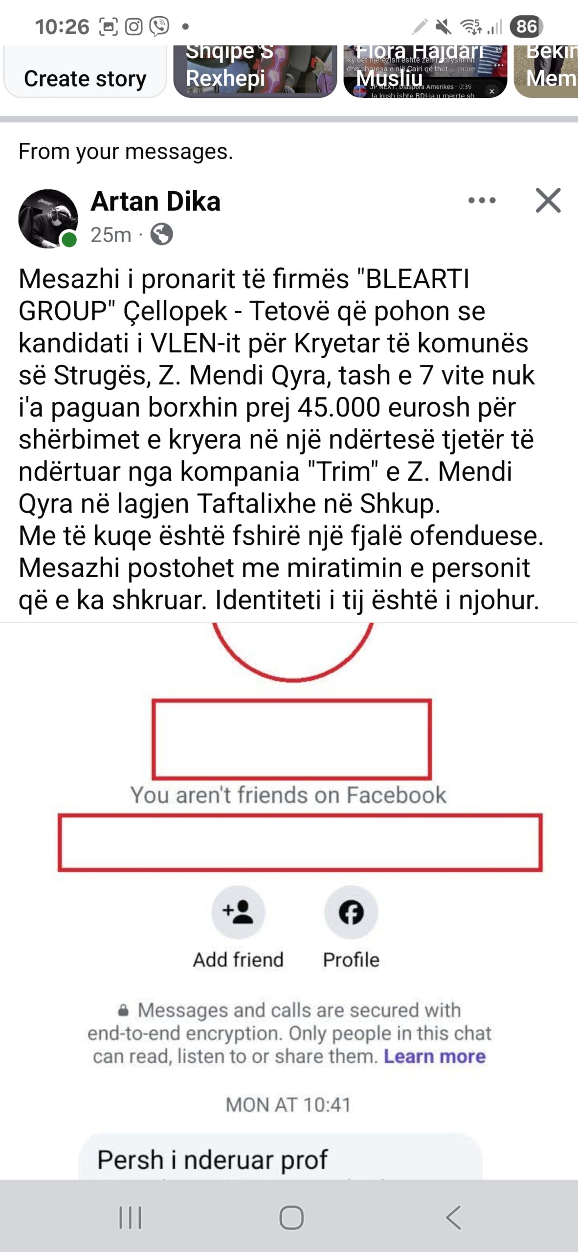 “Mesazhi i pronarit të firmës “BLEARTI GROUP” Çellopek – Tetovë që pohon se kandidati i VLEN-it për Kryetar të komunës së Strugës, Z. Mendi Qyra, tash e 7 vite nuk i’a paguan borxhin prej 45.000 eurosh për shërbimet e kryera në një ndërtesë tjetër të ndërtuar nga kompania “Trim” e Z. Mendi Qyra në lagjen Taftalixhe në Shkup.