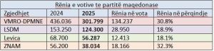 “Rënia e VMRO-DPMNE-së është e jashtëzakonshme – 135.000 vota më pak, që përbëjnë 30.8% të votave, ndërsa ZNAM bie nga 56.200 në 38.034 vota, duke humbur 33% të mbështetjes dhe duke u cilësuar si humbësi më i madh. Në të kundërt, LSDM ka humbur vetëm 18% të votave, çka – duke pasur parasysh pjesëmarrjen më të ulët në zgjedhje – pothuajse nuk përbën humbje reale. Partia Levica, e cila dje gënjeu në mënyrë triumfaliste duke pretenduar se po bëhej lidere e opozitës, ka humbur po të njëjtin përqindje votash si LSDM, me një përmirësim të lehtë vetëm në nivel të qytetit të Shkupit. Në total, Levica ka 2.2 herë më pak vota se LSDM, gjë që tregon se deklaratat e euforike të Apasievit nuk kanë asnjë lidhje me realitetin”.