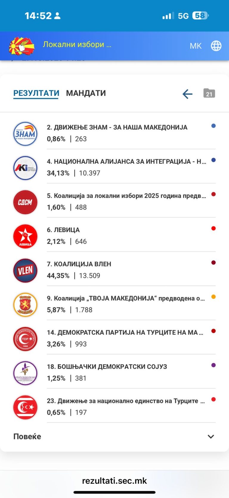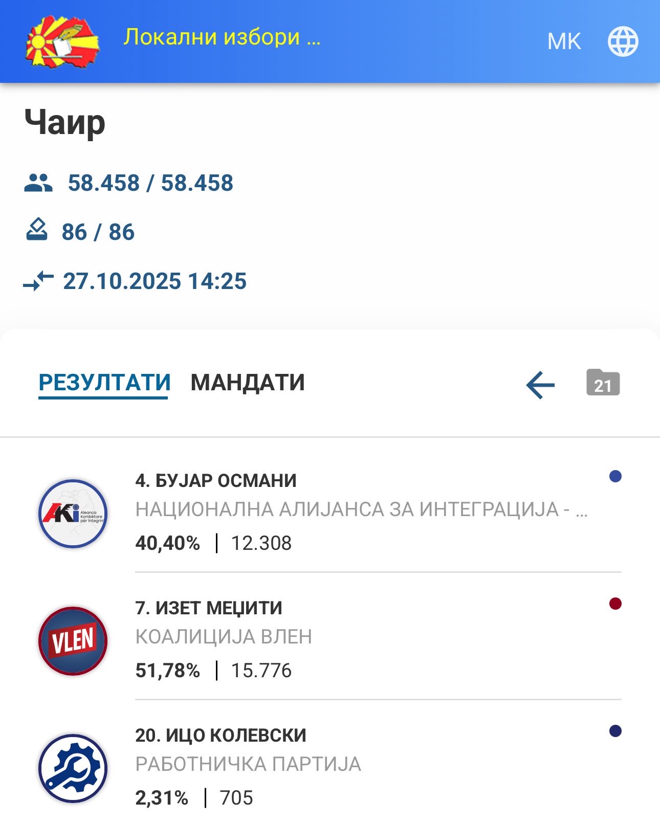 Izet Mexhiti ka marrë 15.776 vota, ndërsa lista e këshilltarëve të VLEN-it ka siguruar 13.509 vota – një diferencë prej 2.267 votash.